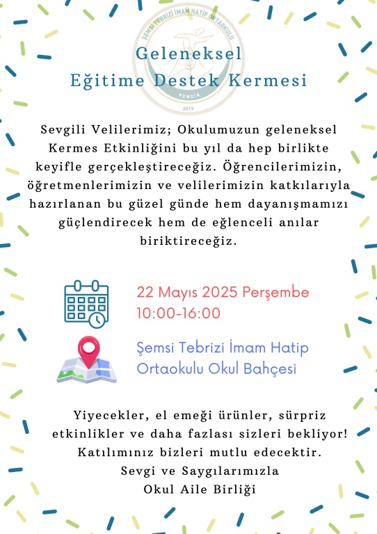 Sevgili Velilerimiz; 22 Mayıs Perşembe günü okulumuzun geleneksel Kermes Etkinliğini bu yıl da hep birlikte keyifle gerçekleştireceğiz.